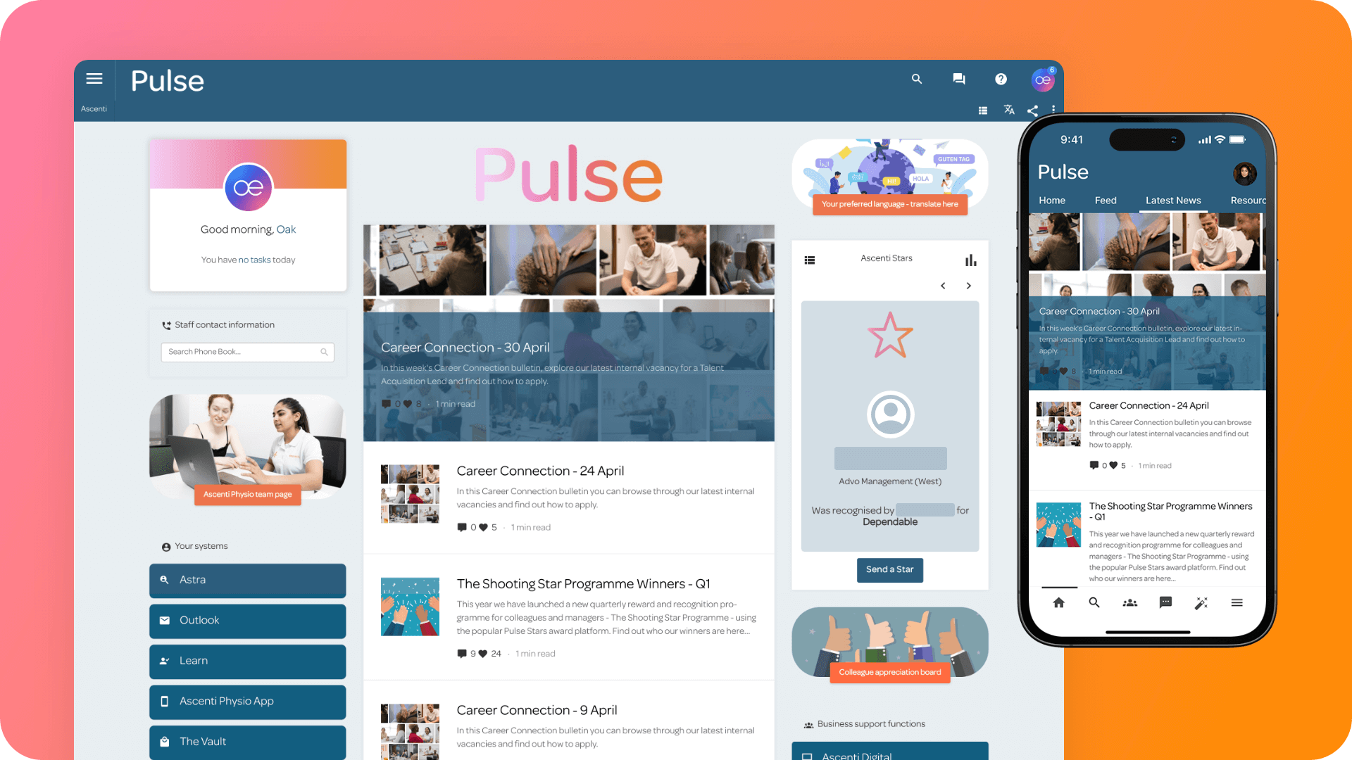 Customers Ascenti keeps a finger on the pulse of employee engagement Ascenti is the leading provider of physiotherapy and mental health services in the UK. Their national network of Ascenti clinicians deliver over 600,000 treatment sessions to people in the public and private sectors each year. Their industry-leading digital health services modernise the patient experience, and with ‘Pulse’, their intranet powered by Oak Engage, they have been able to reflect their digital edge internally and level up their employee experience. We have worked together since 2018 and the results speak for themselves. Industry: Healthcare No. of users: 800+ Area: UK Results with Oak 93% quarterly engagement 5K+ stars awarded annually 85% monthly engagement The Challenge With a workforce spread across 300 UK clinics, Ascenti needed a tool to unite their colleagues on a single platform where they can quickly access information and collaborate with colleagues in what can often feel quite a solitary role when dealing with patients one-to-one. Ascenti’s intranet, ‘Pulse’, is accessible via desktop and mobile, which means that wherever and whenever needed, all employees can find everything work-related they could possibly want, all in one place. Outdated tools Our partnership with Ascenti has been ongoing for a number of years and continues to go from strength to strength. As our product has developed over the years, so have the ways in which Ascenti uses it to develop their employee offering. “ “Previously there was no central point of communication, no central staff database and no methods for teams to collaborate. Employees compensated for the lack of intranet by using other tools, therefore there was inconsistency across the business. We struggled with the lack of design capabilities and reporting on our old intranet so we weren’t able to create engaging content or draw conclusions on what employees were engaging with.” Paige Hatcher Communications Officer at Ascenti Group The Solution Finding a partner in Oak Ascenti needed an intranet platform that could drive employee engagement, improve company-wide communication and connect disparate employees. Our intuitive platform with cross-device access was the perfect solution. From our mobile app, content design, HR integrations, analytics tools and personalised homepages, it was clear how our platform would help Ascenti to achieve their goals and nurture their company culture. Colleague involvement from the outset It was evident that to get colleague buy-in, they needed to feel involved in the process. That’s why Ascenti asked colleagues to put forward their suggestions of names for the new intranet. They had a shortlist of over 40 name suggestions which proved that colleagues had taken the time to think about what the company stands for. On the winning intranet name, Paige said: “We whittled the list down to a shortlist and asked our Leadership Team to vote on the final decision. The name that won the vote was ‘Pulse’. We think Pulse is the perfect name for our intranet, as it feels like it connects us all. Also, it’s a nod to healthcare, being the beating heart of connectivity and that we are constantly moving forward.” Connecting dispersed employees With therapists spread across sites up and down the country, the intranet is a central space to connect colleagues no matter where they’re based. With many frontline employees in roles where they may not get to socialise with colleagues between appointments, the employee app brings all the important company information and social spaces together in one place so that nothing gets missed. Personalised homepages Ascenti has streamlined the digital employee experience by ensuring that their people only see content that is relevant to them. Company-wide updates will be seen by all users, but then role, location and department specific information will filter through into each user’s feed based on their settings. Homepages are a single source for everything a colleague will need day to day. They have quick links to tools and third party platforms, which can be tailored for each department, ensuring the tools they use most regularly are accessible in just one click. Content is also tailored via department pages, such as Careers, IT and Governance, so that those in specific departments can see all relevant information in one place. Streamlined processes Admin time has been significantly reduced with the ability to house HR documentation inside the Oak platform, which can be updated with ease. Colleagues can be confident that all policies within their intranet are the most up-to-date versions. When HR teams need to add or update a policy, there’s just one place that they need to update it, ensuring document version control. With dedicated support pages for a range of different systems used by various departments, how-to guides and helpful resources can be stored in one safe place so that it is the first port of call with any issues. This has reduced the amount of queries coming to IT and support colleagues within the business, reducing repetitive admin tasks and streamlining overall operations. A place to nurture company culture Company culture now has a place to be celebrated and lived, day-in, day-out. With a large, dispersed workforce, some of whom are remote therapists offering virtual sessions, community hubs enable connections beyond the daily duties of work to bring people closer together, despite distance. Colleagues can share in-the-moment praise for their colleagues on their virtual ‘Colleague Appreciation Board’ for going the extra mile or a job well done. Employee shout-outs are posted very regularly, with colleagues sharing appreciation for their peers over 150 times each year. In addition to this, the ‘Ascenti and Advo Stars’ awards programme is based on the company values: Dependable, Caring, Pioneering and United. Employees can send a star to a colleague based on 